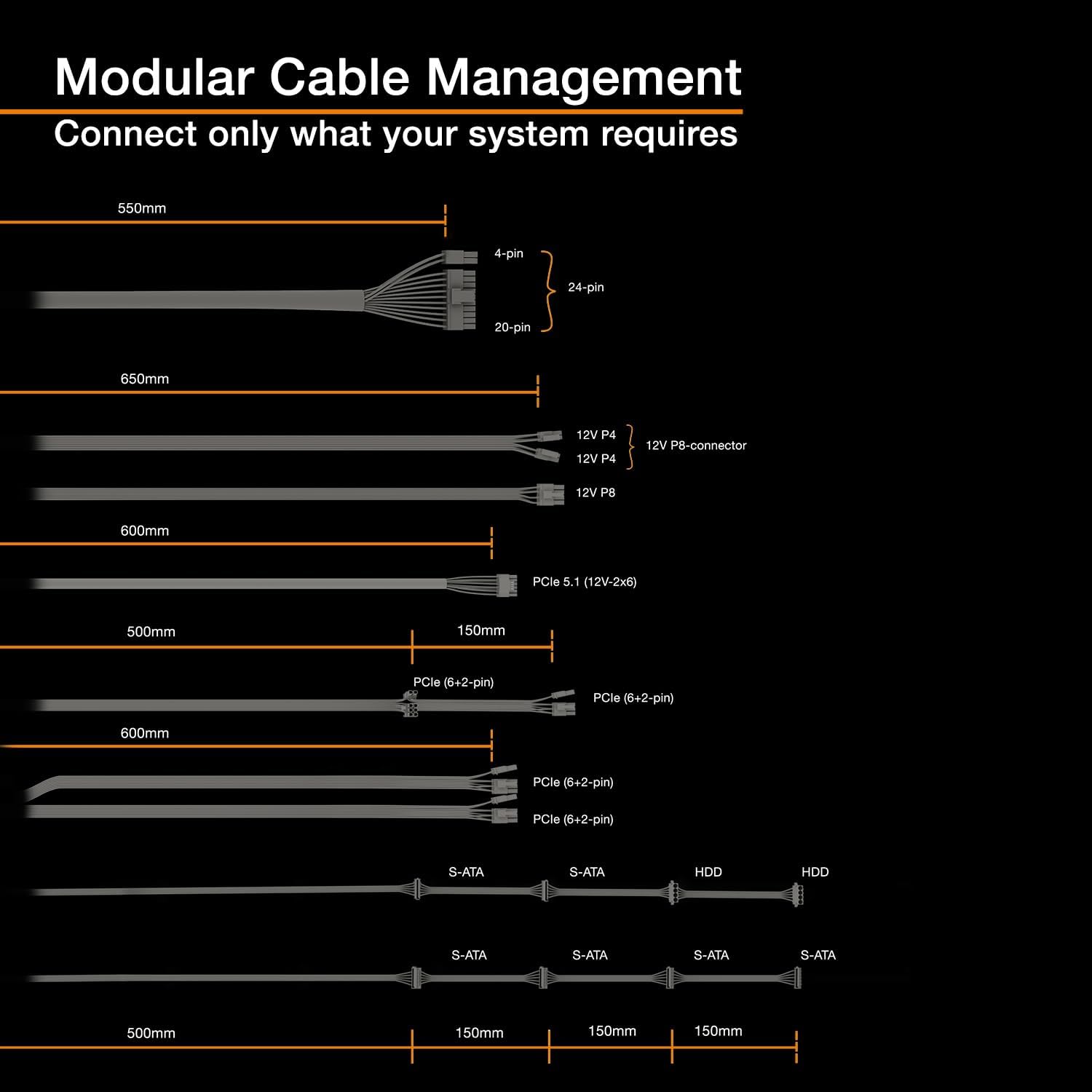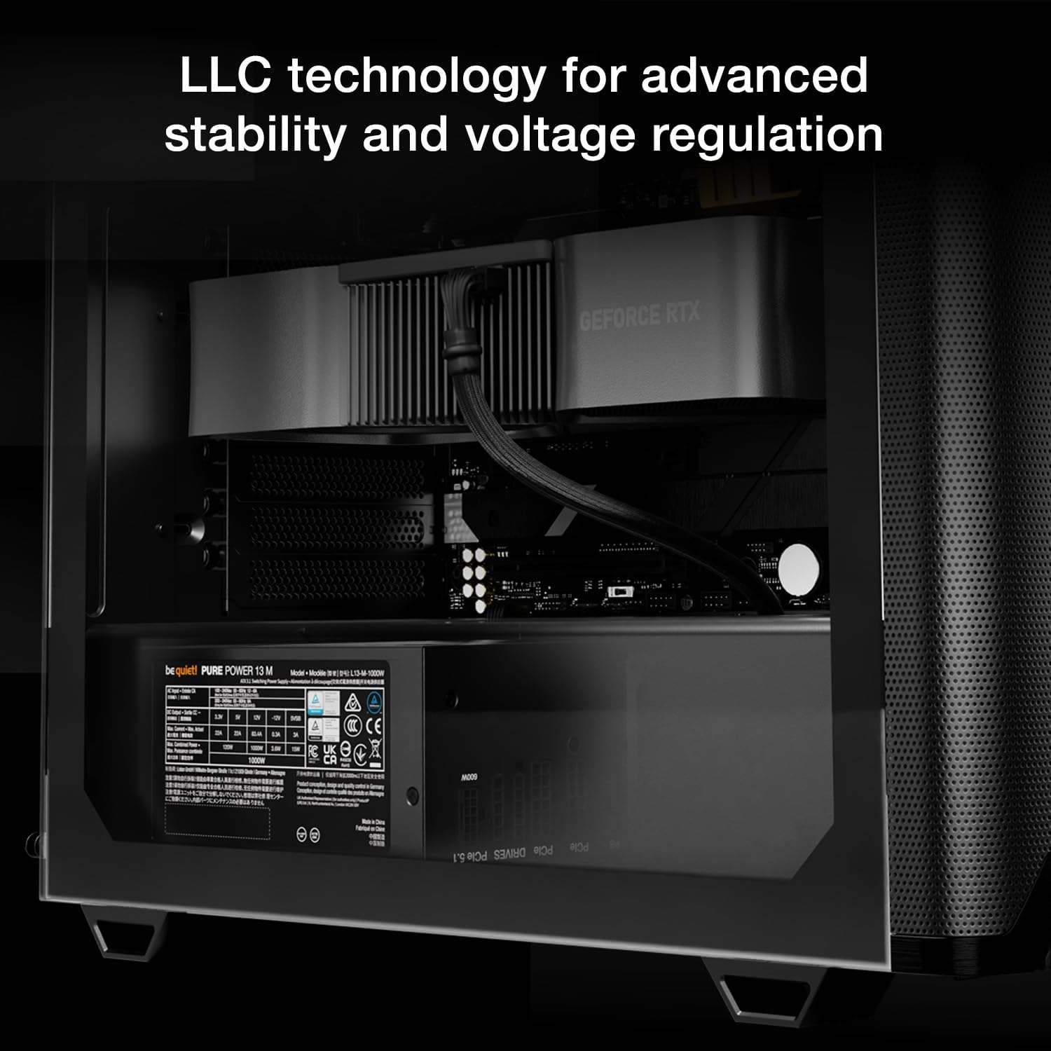 The Pure Power 13 M 1000W delivers high efficiency and modern ATX 3.1 performance for powerful gaming builds. Featuring 80 Plus Gold efficiency up to 94.4%, a fully modular design, and native 12V-2x6 support for PCIe 5.1 GPUs, it’s built for next-gen hardware. Its single-rail design handles heavy transient GPU loads, while the semi-passive 120mm fan provides silent operation during low demand. LLC topology ensures stable voltage regulation, making it ideal for high-end and overclocked systems.